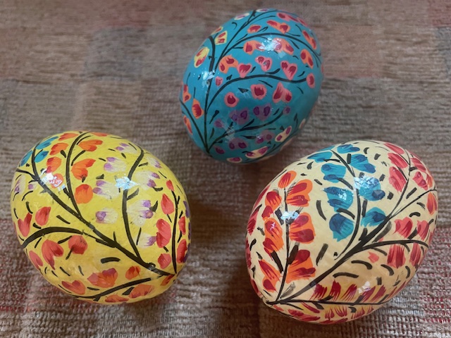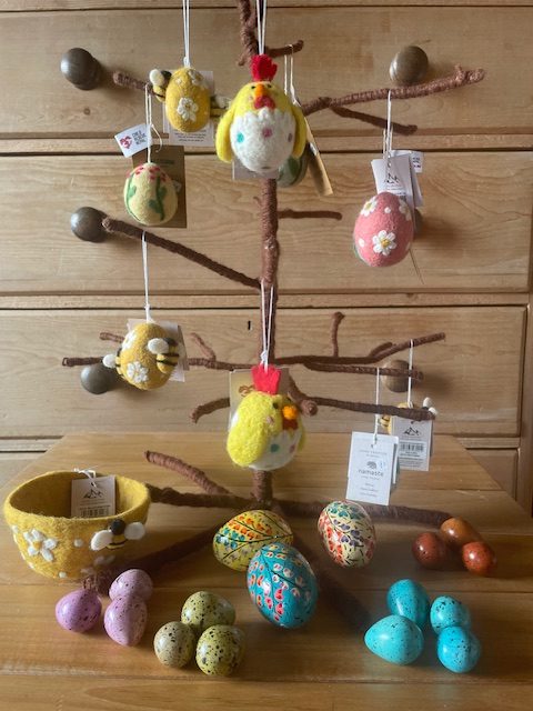 What about an egg to treasure and give lasting pleasure? Namaste has a range of beautiful hand painted Kashmiri eggs, decorative felt eggs from Nepal and mini speckled soapstone eggs (30% offer on the latter). My favourite is the felt chicken in egg! See Namaste’s full range for Easter.